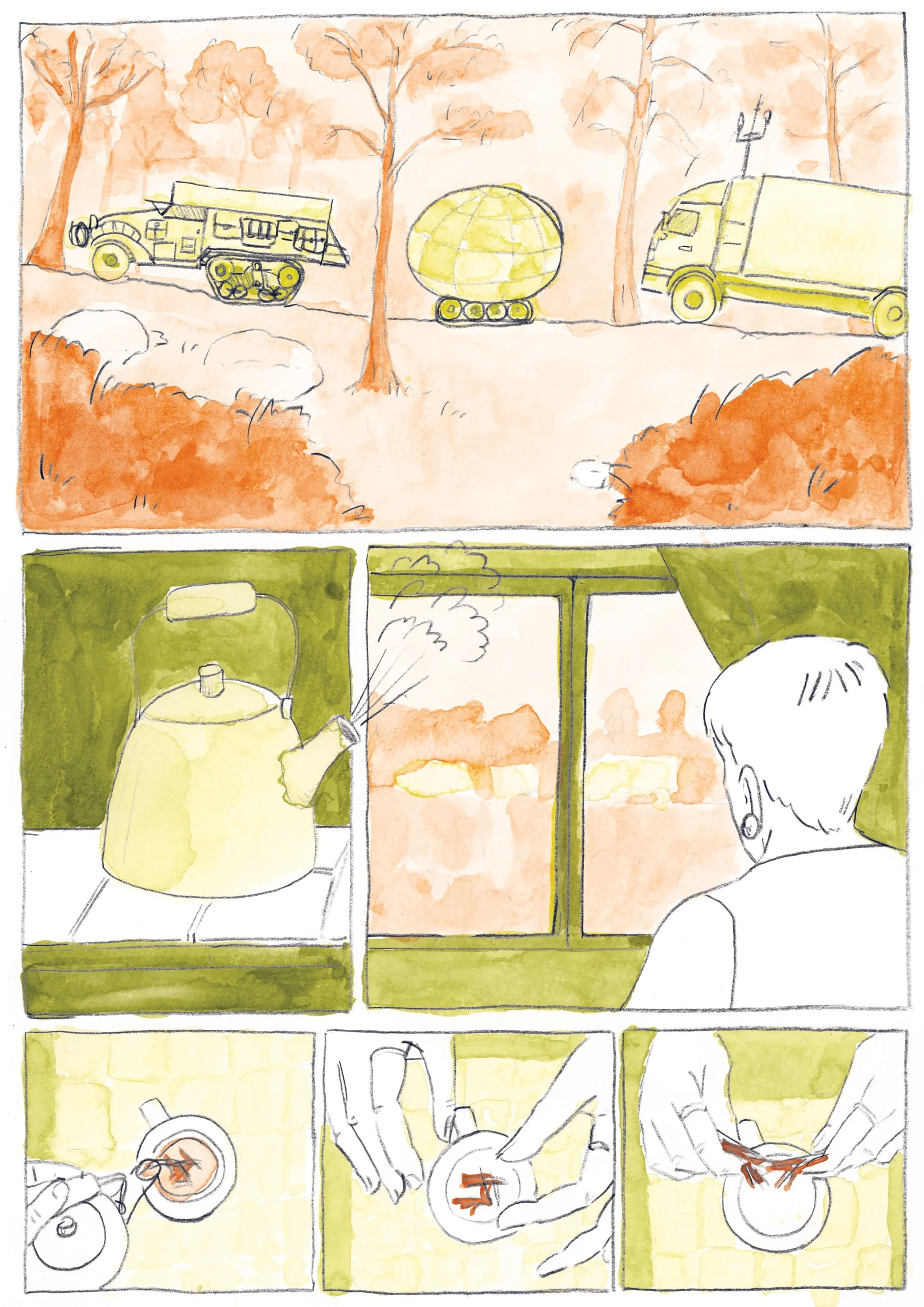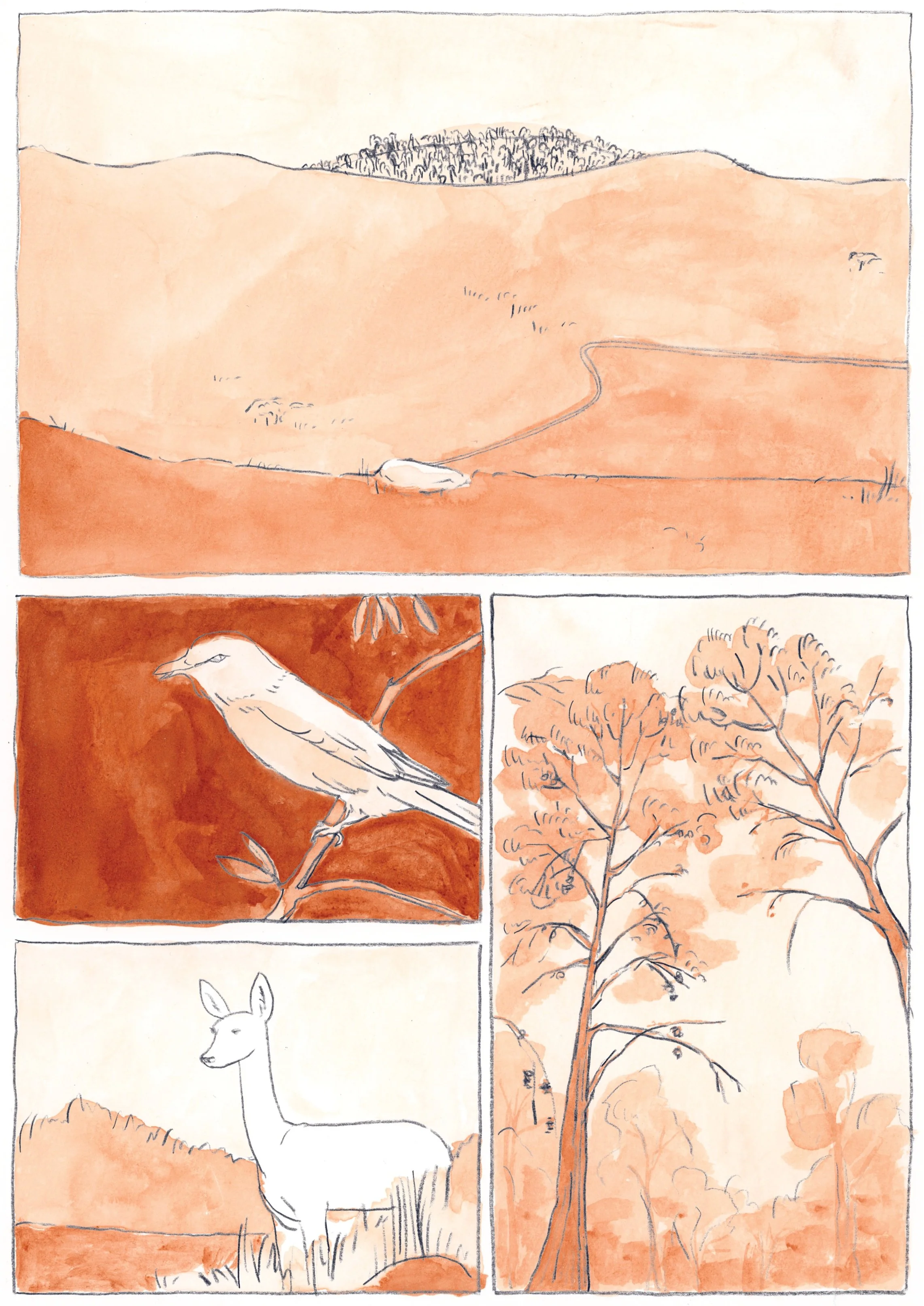 The first two chapters of Parallel Grounds were developed as part of my graduation project. The story was inspired by my research into Yatir Forest, a man-made forest in Israel. The comic explores the complexity of perspectives under an authoritarian regime using ecological themes and visual storytelling.